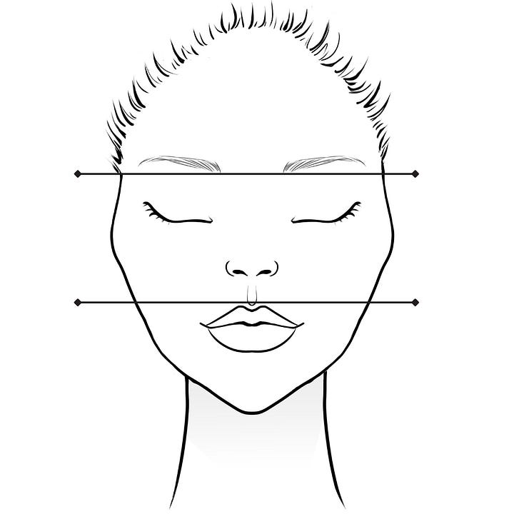 We measure symmetry by drawing a line down the center of the face and then horizontally drawing two lines, one at the brows and the other at the bottom where the cheekbones lay, close to the top of the lips. Vertical symmetry (photo 1) is determined by how wide each side of the face is and horizontal symmetry (photo 2) is determined by how tall each section of the face is. The more even these measurements, the more symmetrical the face.